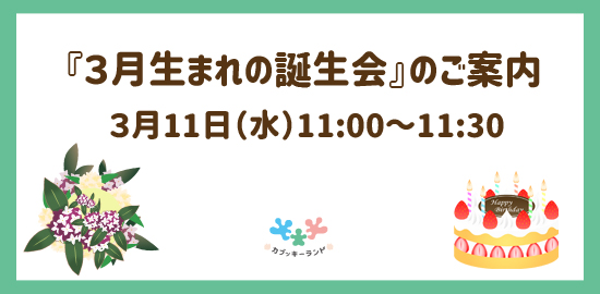 すくすくひろばで『3月生まれの誕生会』を開きます !! 皆さまのご参加 お待ちしております(^^♪【日時】3月11日(水)11:00~11:30(10:45 ひろば集合!)【金額】500円(当日お申込みください)【内…