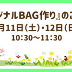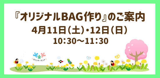 野山もポカポカ春の装いですね !! オリジナル BAG を作って お出かけしてみませんか?【開催日】4月11日(土)・12日(日)【時 間】10:30~11:30【内 容】布製ミニバッグに好きなプリントを貼ったり絵を…