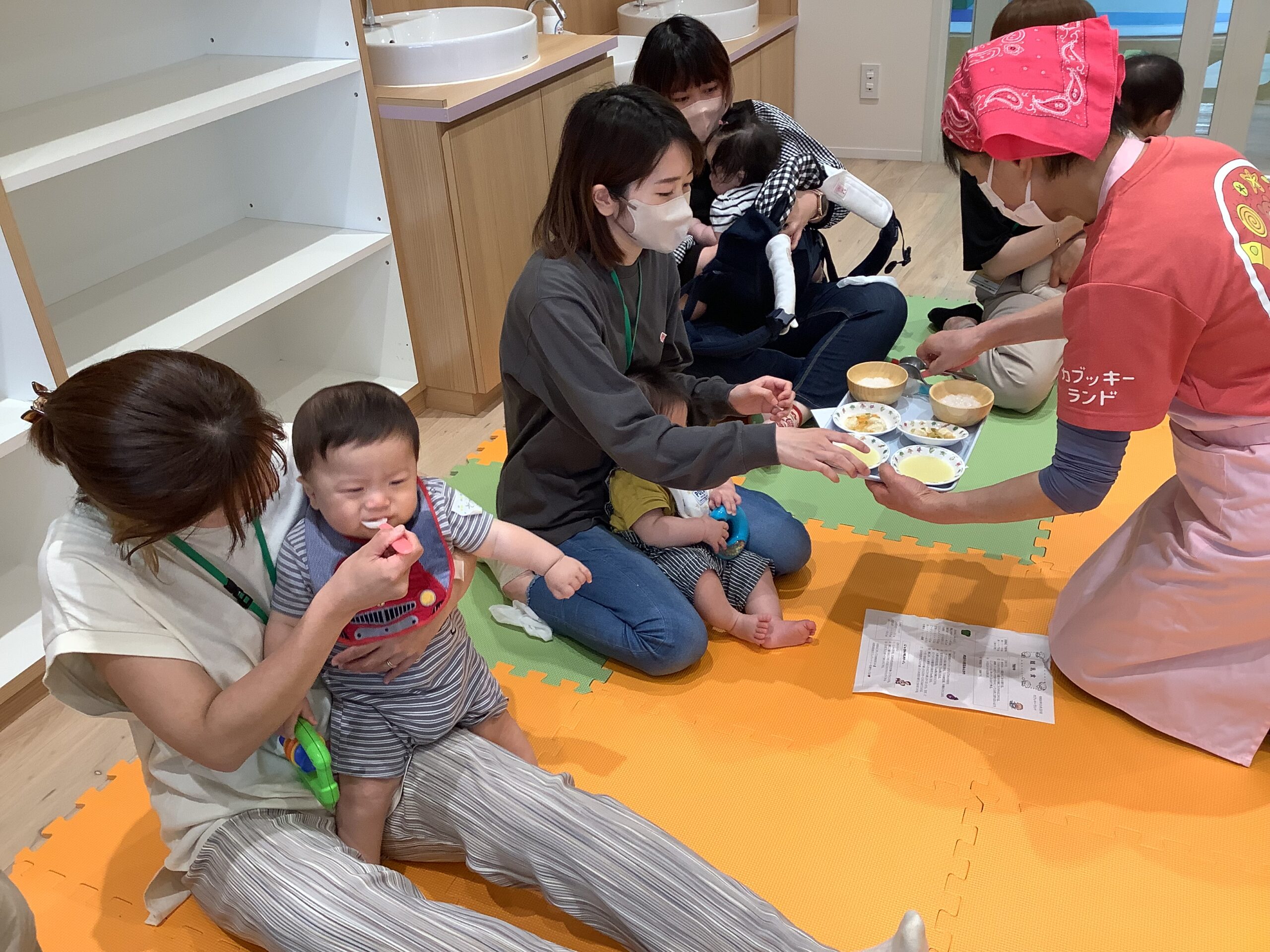 「ふれ合い遊び」を楽しんだ後は、みんなで仲良く「いただきまーす!」離乳食を美味しく食べましたよ (^_-)-☆ 6ヵ月~9ヵ月のお友だちが、たくさん参加してくれ、見ているだけでニコニコ笑顔になるステキな会になりました。離乳食の相談やママおすすめの調理法の情報交換も役にたったのでは?ストレスにならないよう頑張って下さいね !!
