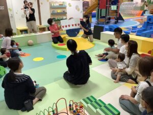 日本全国から「小松」に来てくれた皆さん!ようこそ、ようこそ!です(^_-)-☆ 自己紹介のあと、子どもと一緒に楽しめる施設の情報交換や入園についてのお話しをしましたよ!会の最後に「だるまさんが」の絵本を読んだり、音楽にあわせて触れ合い遊びも楽しみました。