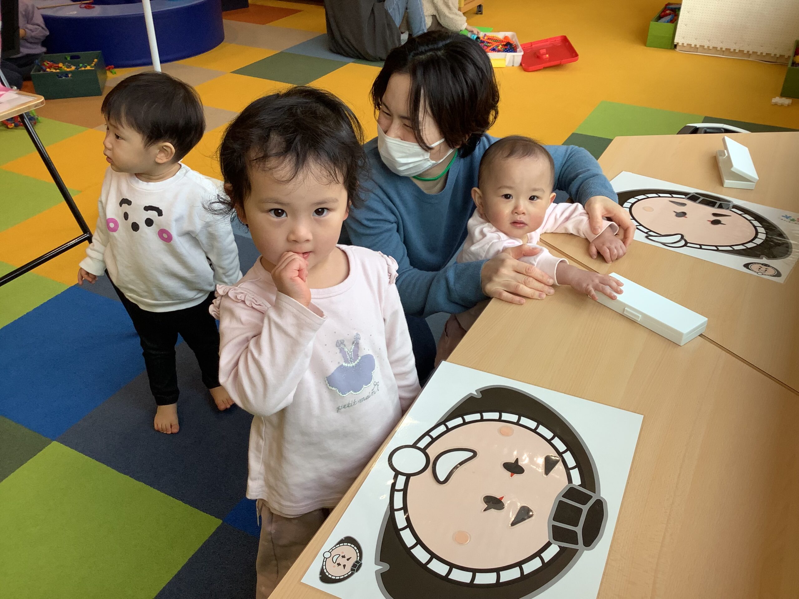 すくすくひろばでは『あけまして おめでとう』の会が開かれ、たくさんのお友だちが参加してくれましたよ (^_-)-☆ お正月にピッタリ!「十二支のはじまり」のお話しを聞いたあとは、みんなで楽しく「かるた」遊びをしました。「カブッキー福笑い」も上手にできたかな?