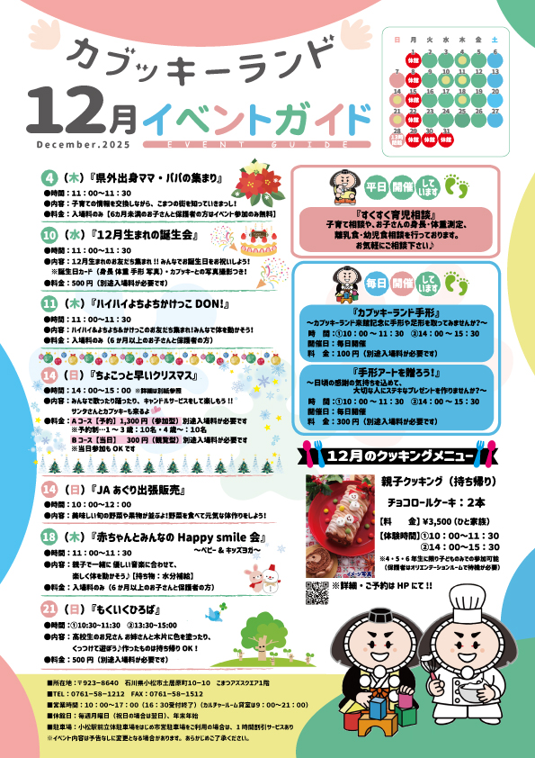 すくすくひろばでは『ちょこっと早いクリスマス』や、『赤ちゃんとみんなの Happy smile 会』で「ベビー&キッズヨガ」が開かれます (^^♪ クッキングスタジオでは『チョコロールケーキ:2本 』を作ります !! 4・5・6年生に限り子どものみでの参加(保護者はオリエンテーションルームで待機)もできます(^_-)-☆