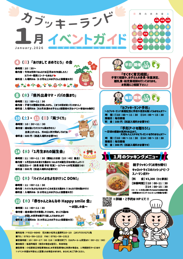 すくすくひろばでは『あけまして おめでとう』の会や『凧づくり』、絵本館の方による「お話しの会」が『赤ちゃんとみんなの Happy smile 会』で開かれます (^^♪ クッキングスタジオでは『キャロットライスのハッシュドビーフ・スノーマンポテト 』を作ります !! 4・5・6年生に限り子どものみでの参加(保護者はオリエンテーションルームで待機)もできます(^_-)-☆