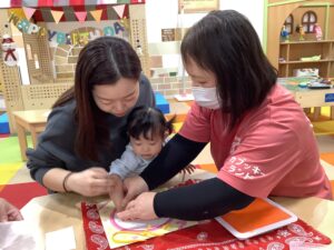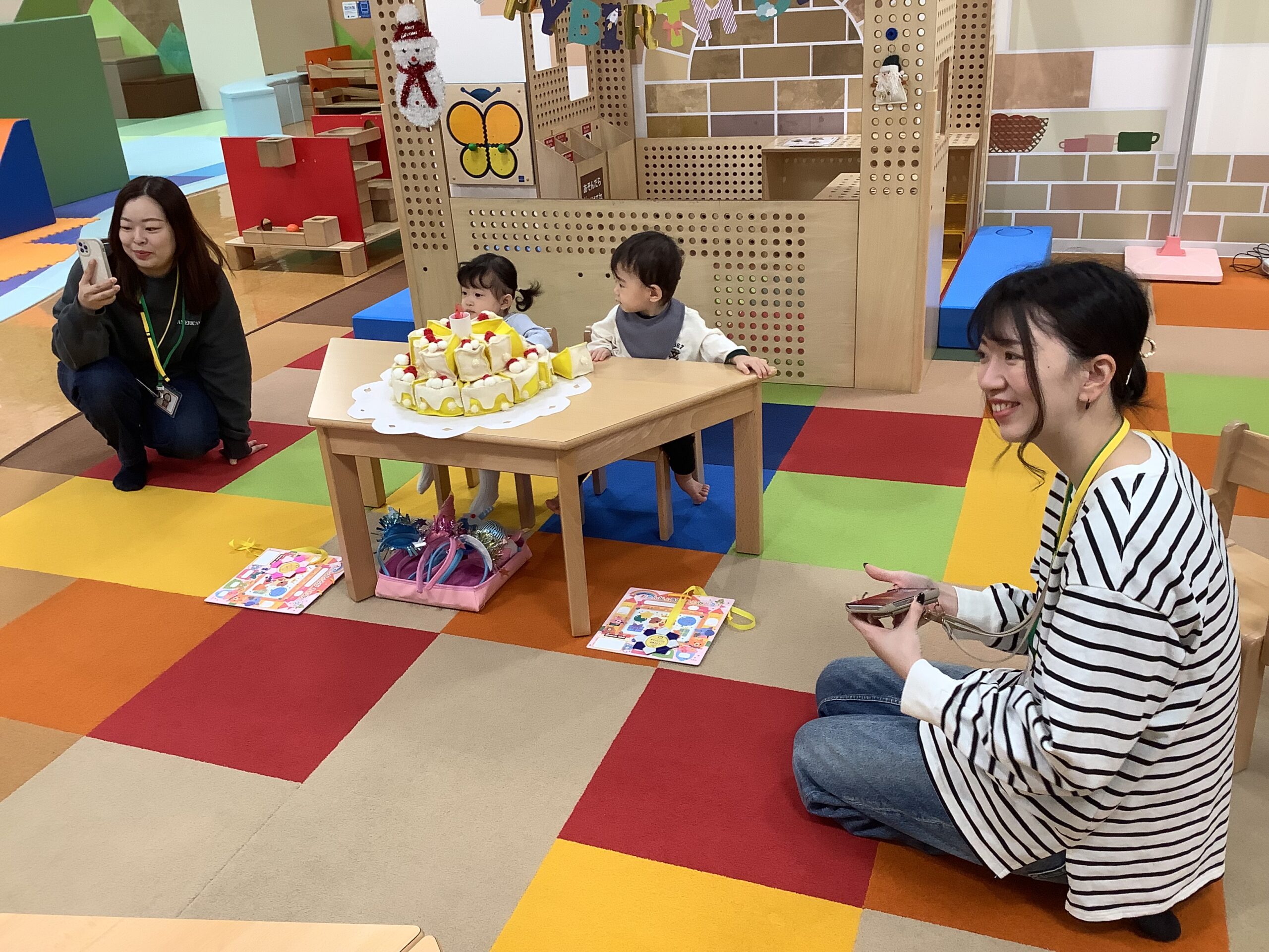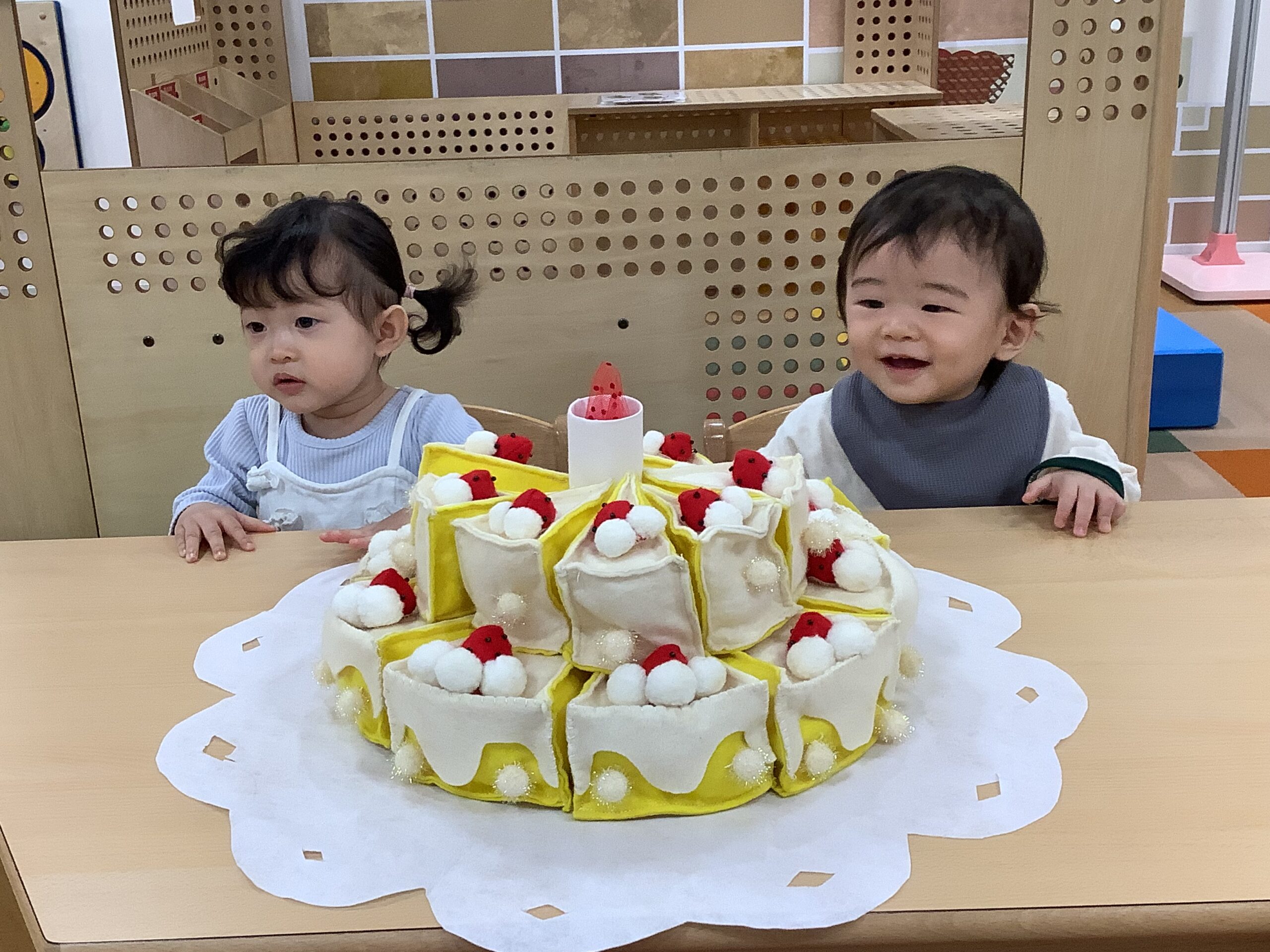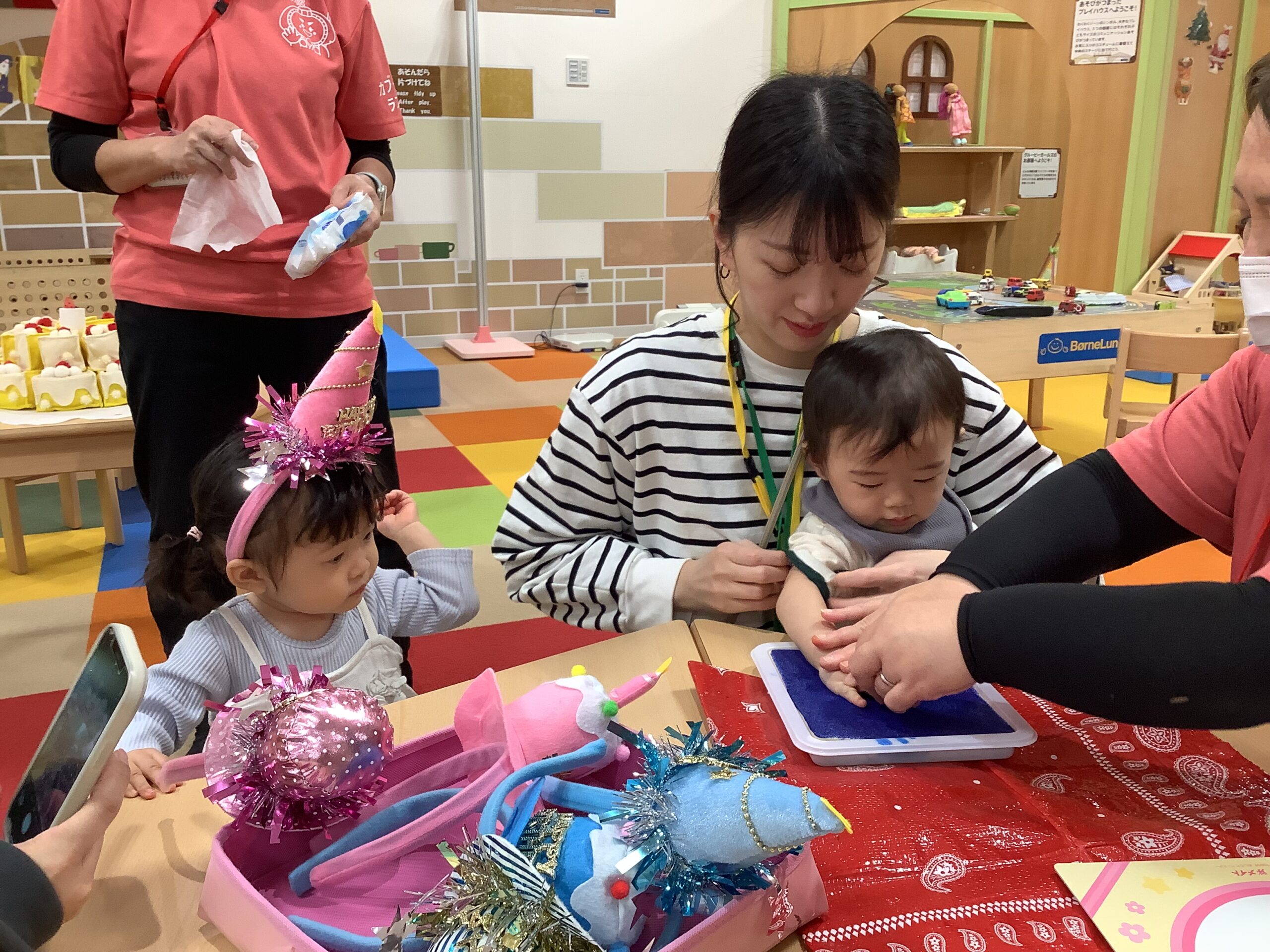 同じお誕生日で、お友だちの ステキな2人が参加してくれました(≧▽≦) カブッキーからプレゼントをもらったり、お行儀よくイスに座り みんなと一緒に誕生日の歌を楽しみましたよ(^_-)-☆ 手形足形も上手に ペッタン!かわいいカードが出来上がりました✨1歳のお誕生日 おめでとうございます。