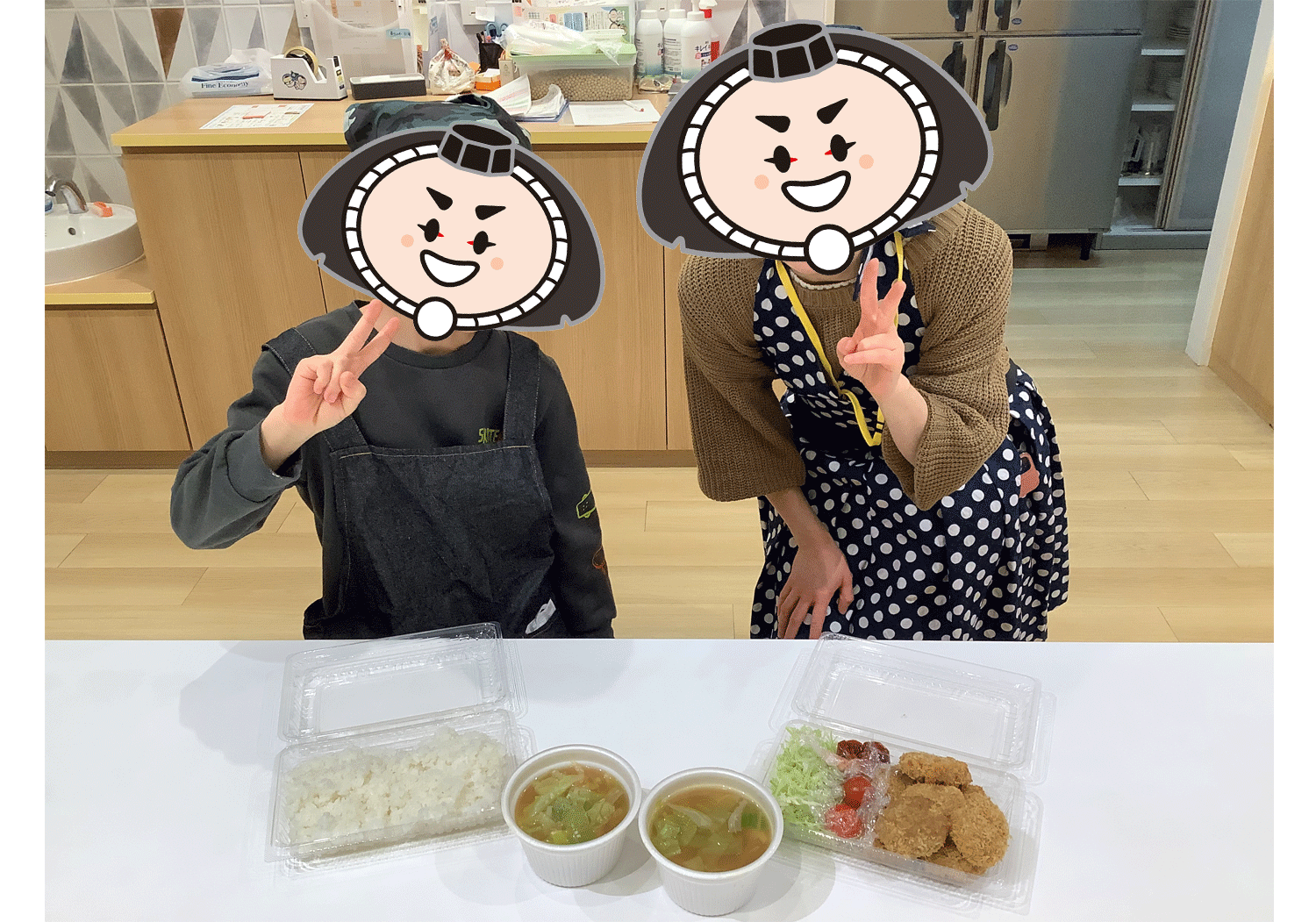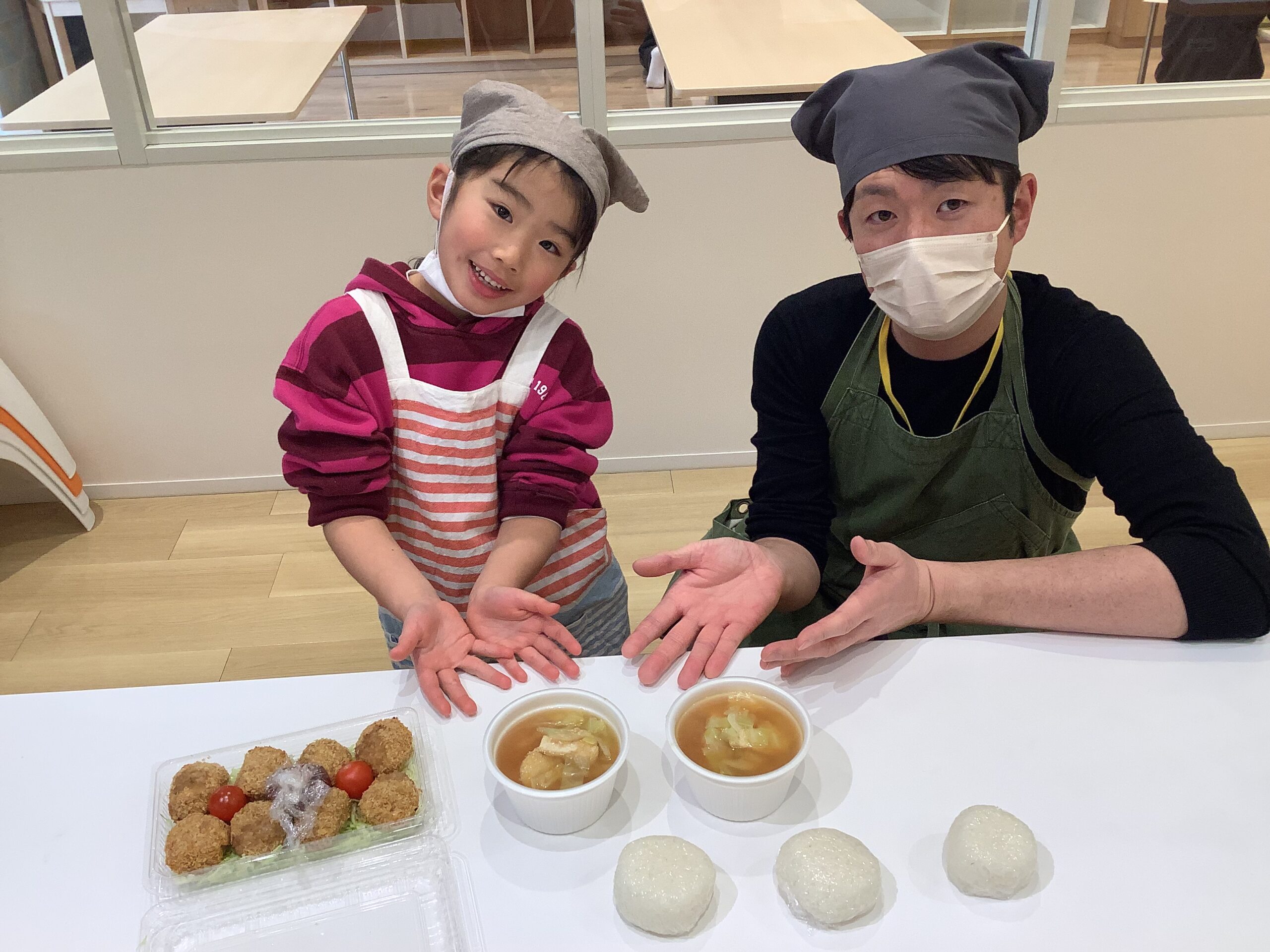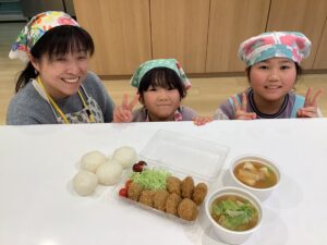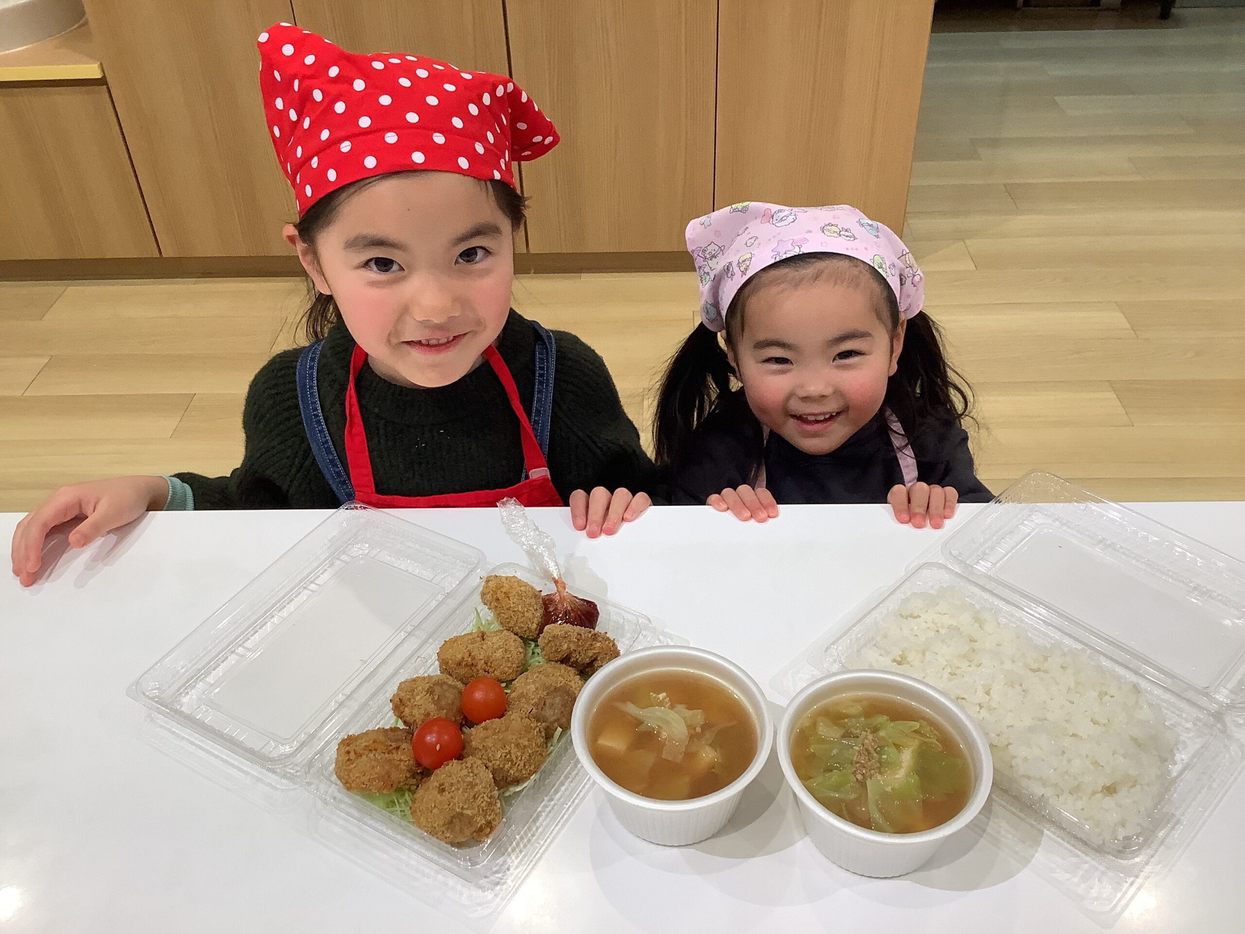 上手に種を丸め 衣をつけ!オーブンでこんがり焼き上げて…あつあつサクサクキャベツメンチのできあがりぃ~(^_-)-☆ 自家製味噌を使った 栄養たぁ~っぷりの具だくさん味噌汁!美味しく食べて、寒い冬を元気に過ごしましょう!出来立てを となりのオリエンテーションルームで食べて帰るお友だちもいましたよ !!