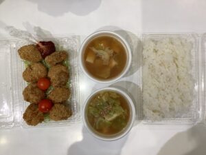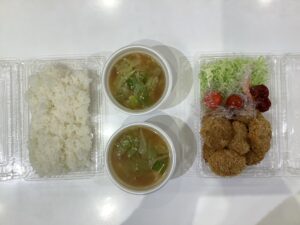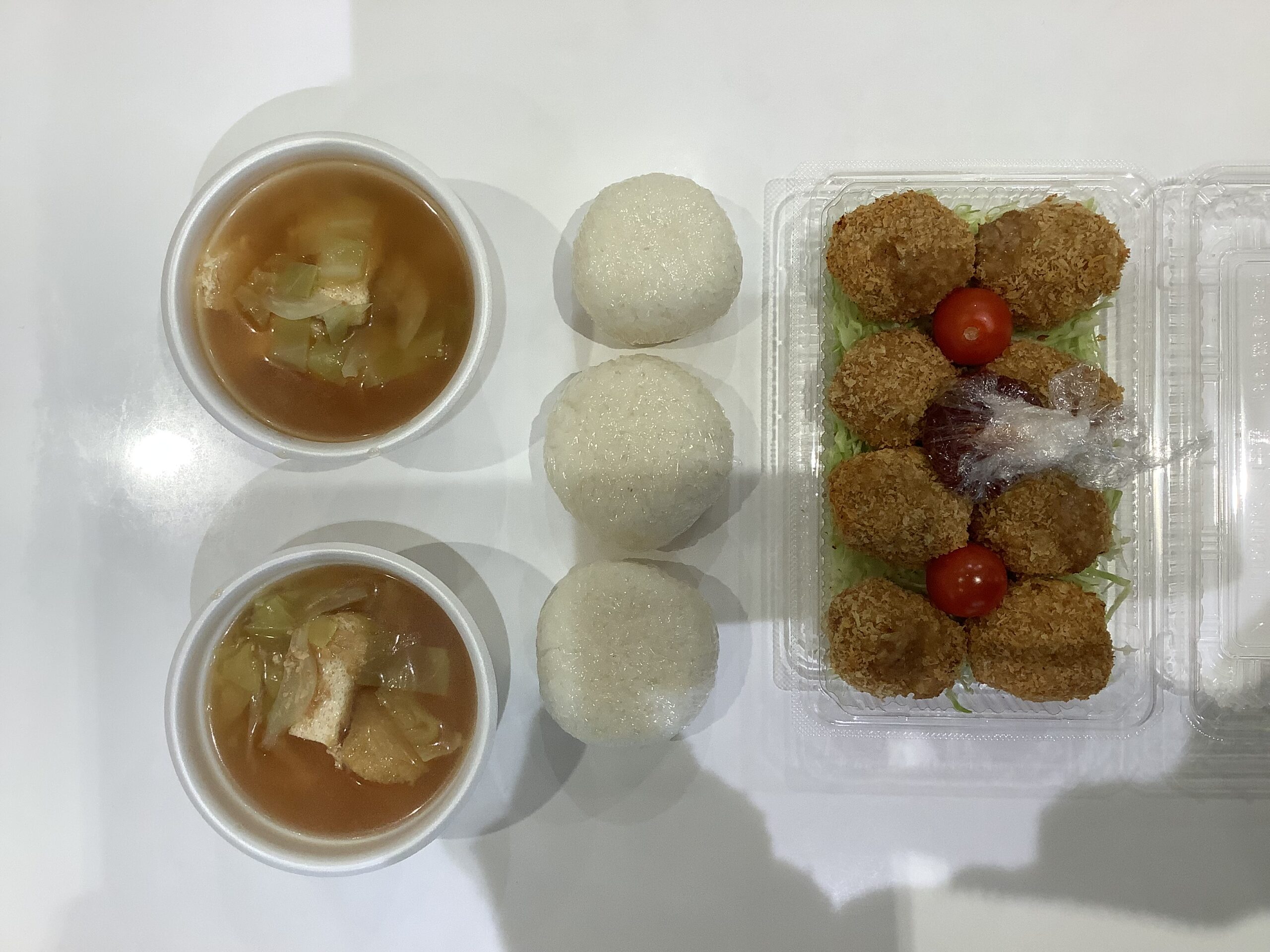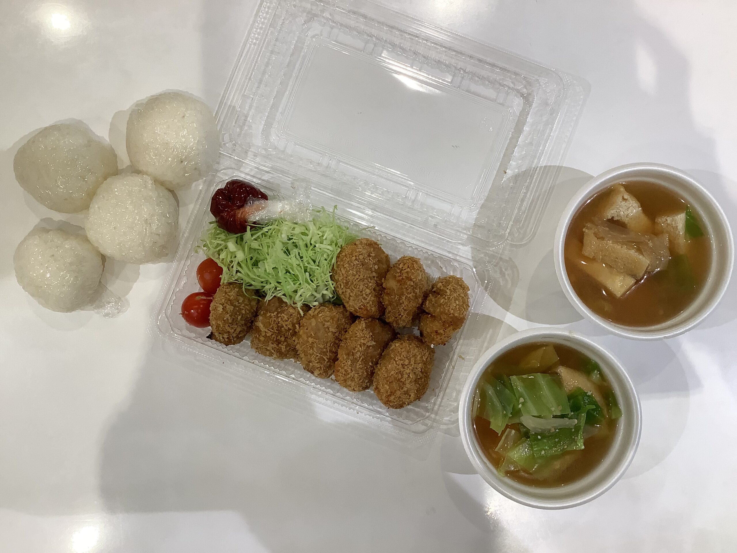 今日から2月メニュー『キャベツメンチ・キャベツと油揚げの味噌汁・ごはん』が始まりました (^^♪