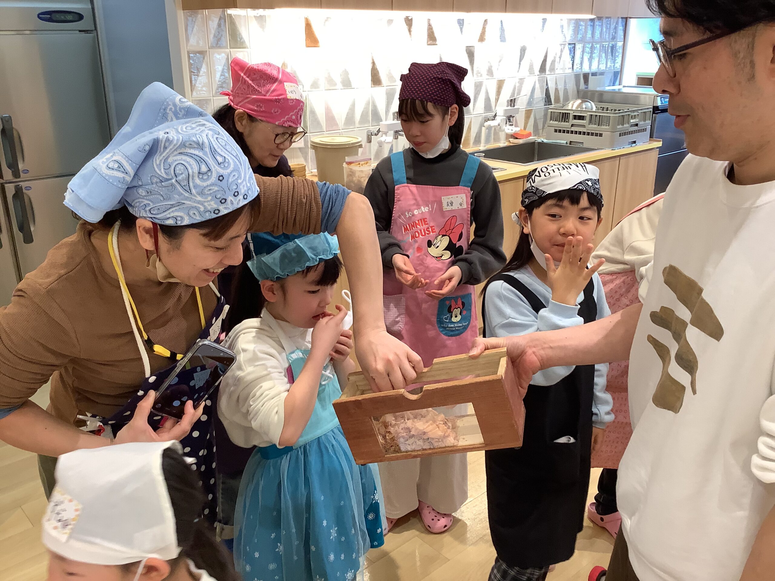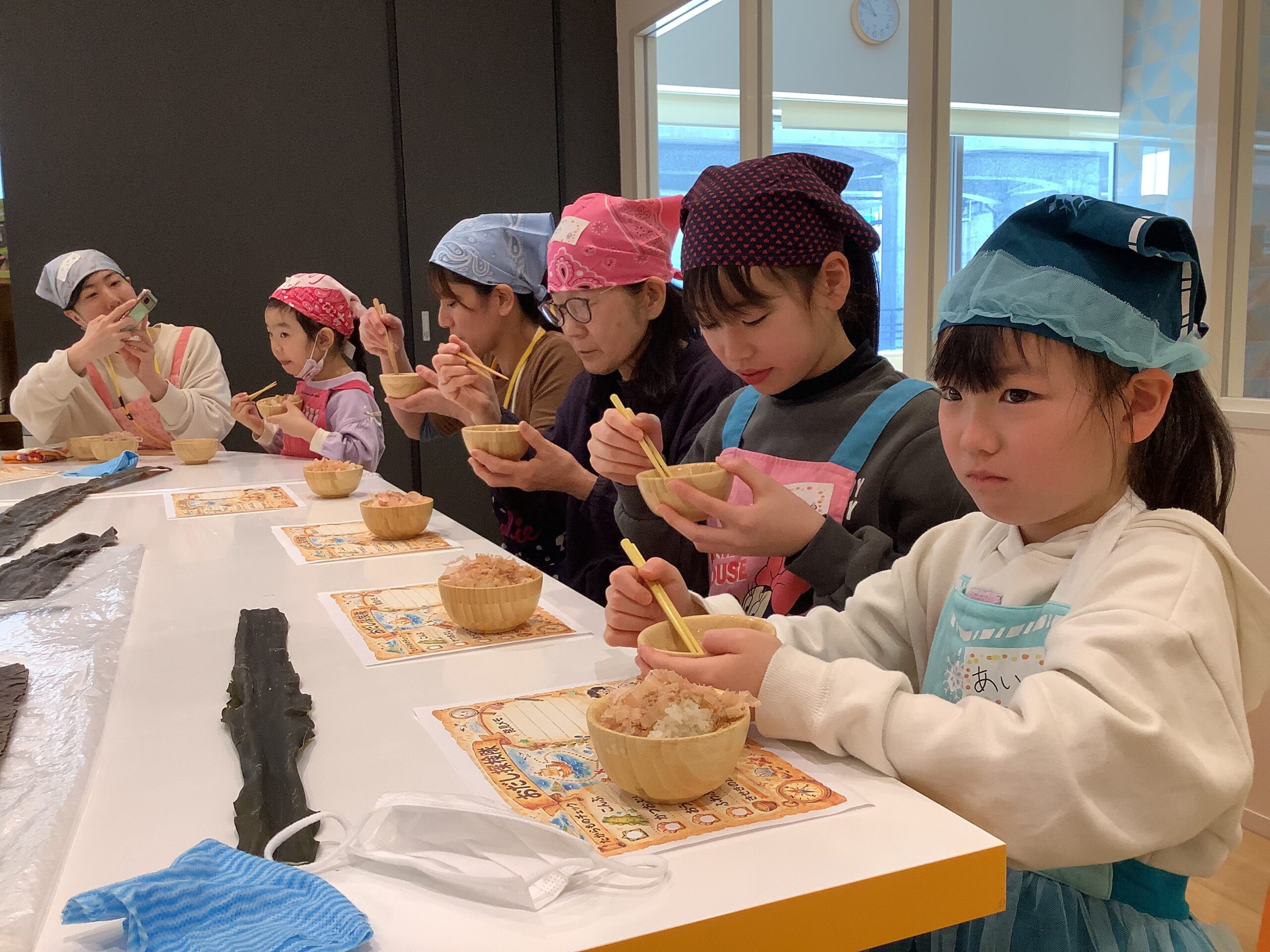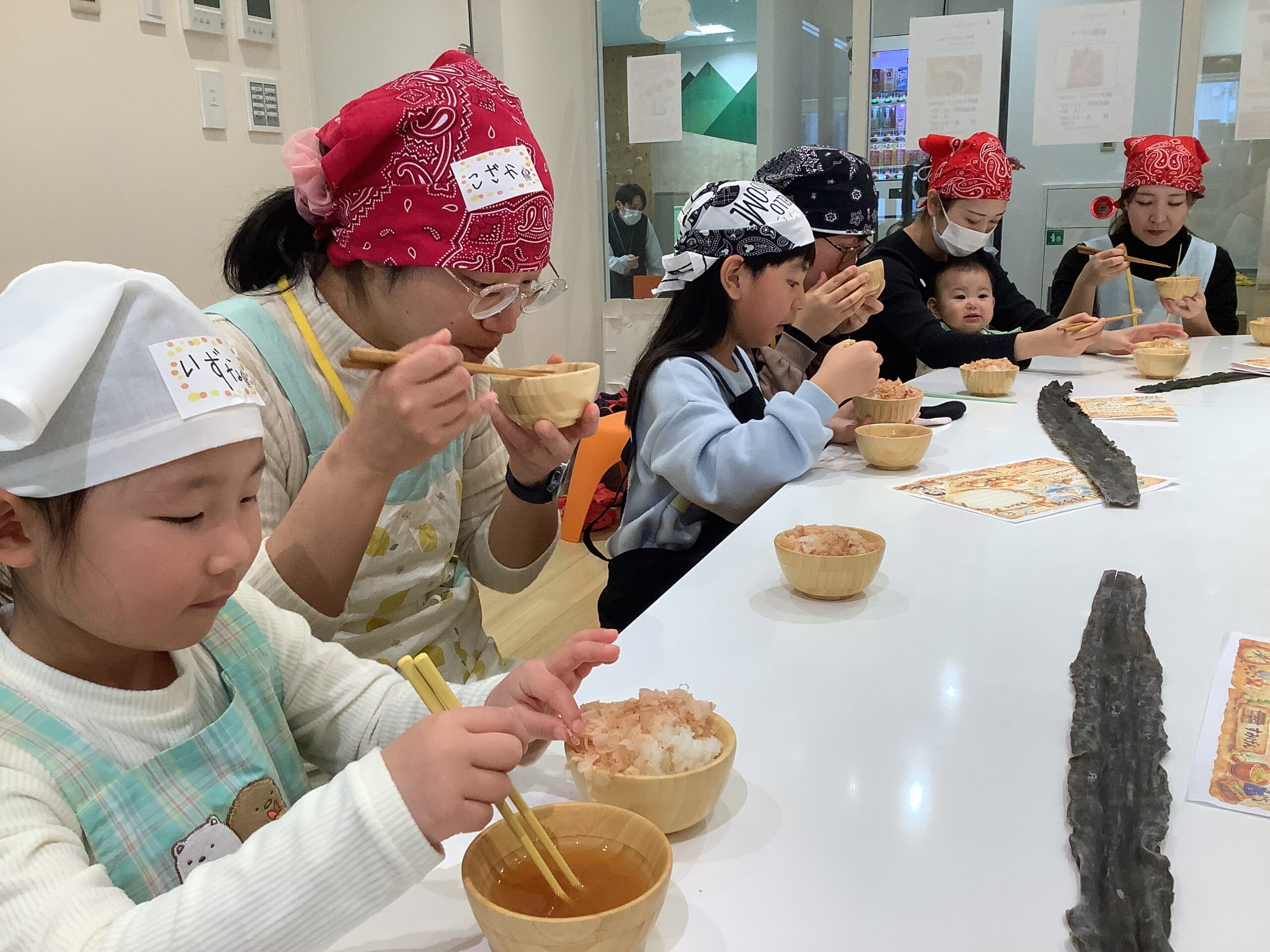 まず初めに、厳選された昆布とカツオ節を使った「だし」を味わいました!昆布だしには「グルタミン」かつおだしには「イノシン」の 美味しくなる魔法のことばを唱えましたよ!…2つを合わせた黄金のだしには「相乗効果」を唱え、パワーアップした うま味を味わうことが出来ました。黄金だし作りの実演を見たあとは、黄金だしの味噌汁と削りたての鰹節を乗せたホカホカご飯を「いただきまぁ~す!」(^_-)-☆ 本格だしの味を、しっかり五感で覚えました !!