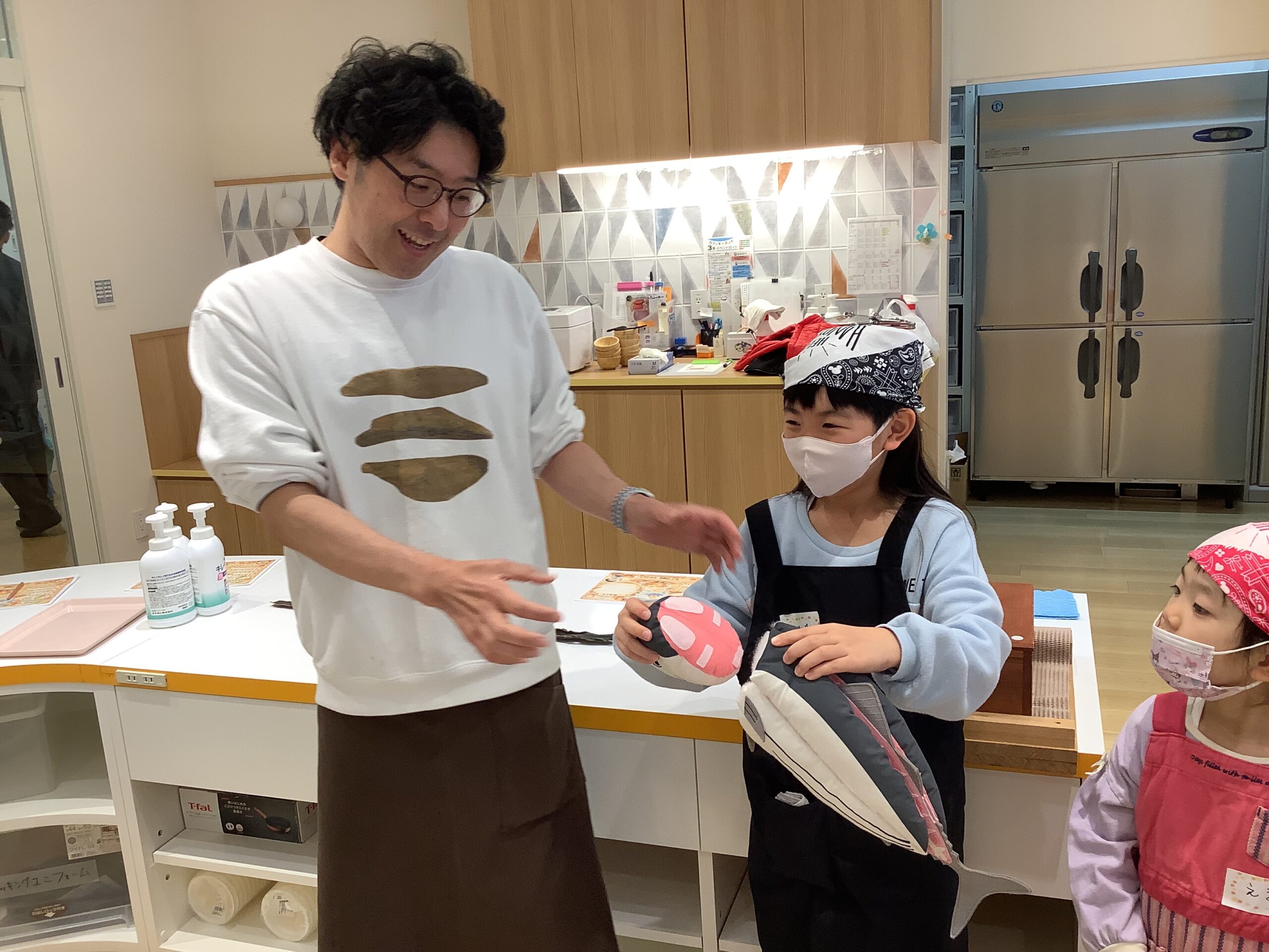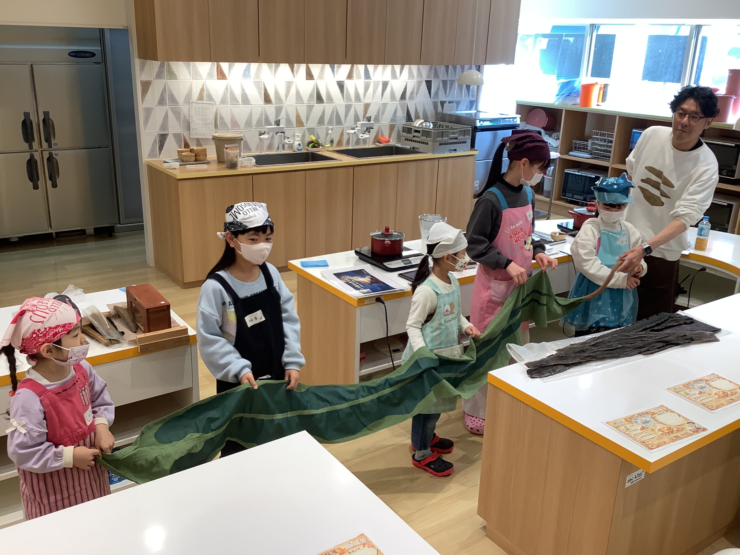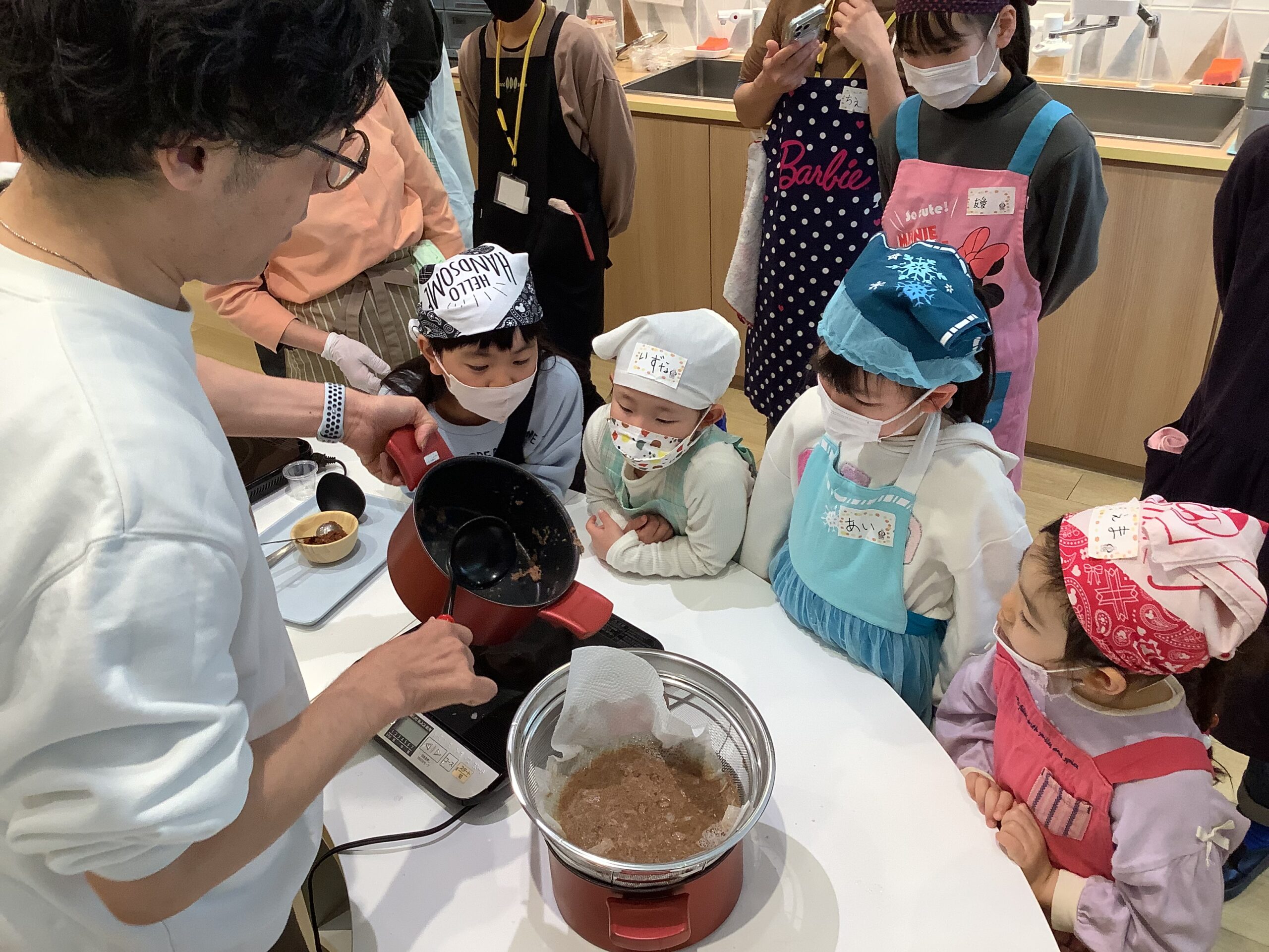 まず初めに、厳選された昆布とカツオ節を使った「だし」を味わいました!昆布だしには「グルタミン」かつおだしには「イノシン」の 美味しくなる魔法のことばを唱えましたよ!…2つを合わせた黄金のだしには「相乗効果」を唱え、パワーアップした うま味を味わうことが出来ました。黄金だし作りの実演を見たあとは、黄金だしの味噌汁と削りたての鰹節を乗せたホカホカご飯を「いただきまぁ~す!」(^_-)-☆ 本格だしの味を、しっかり五感で覚えました !!