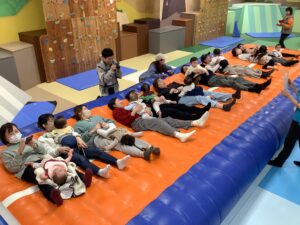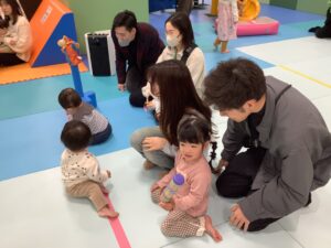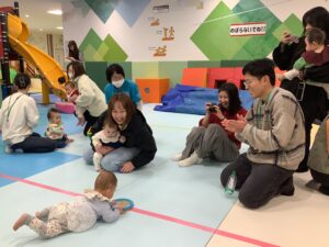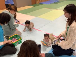 たくさんのお友だちとお家の方が参加してくれ、ワイワイにぎやかな会になりましたよ (^_-)-☆「よぉ~いドン!」かけっこの みんなは、あっという間に走り抜けていました!ハイハイのみんなは、途中で泣いてしまったり 猛スピードでゴールしたり、それぞれのペースで頑張っていましたよ。また来月も来てくださいね!