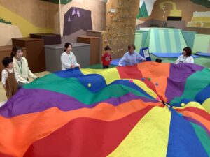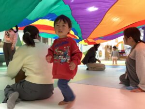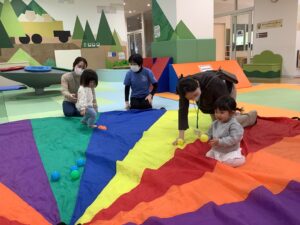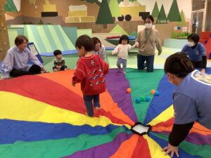 今日は、すくすくひろばで みんなと一緒に「パラバルーン」をして遊びました (^^♪