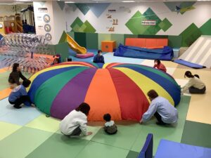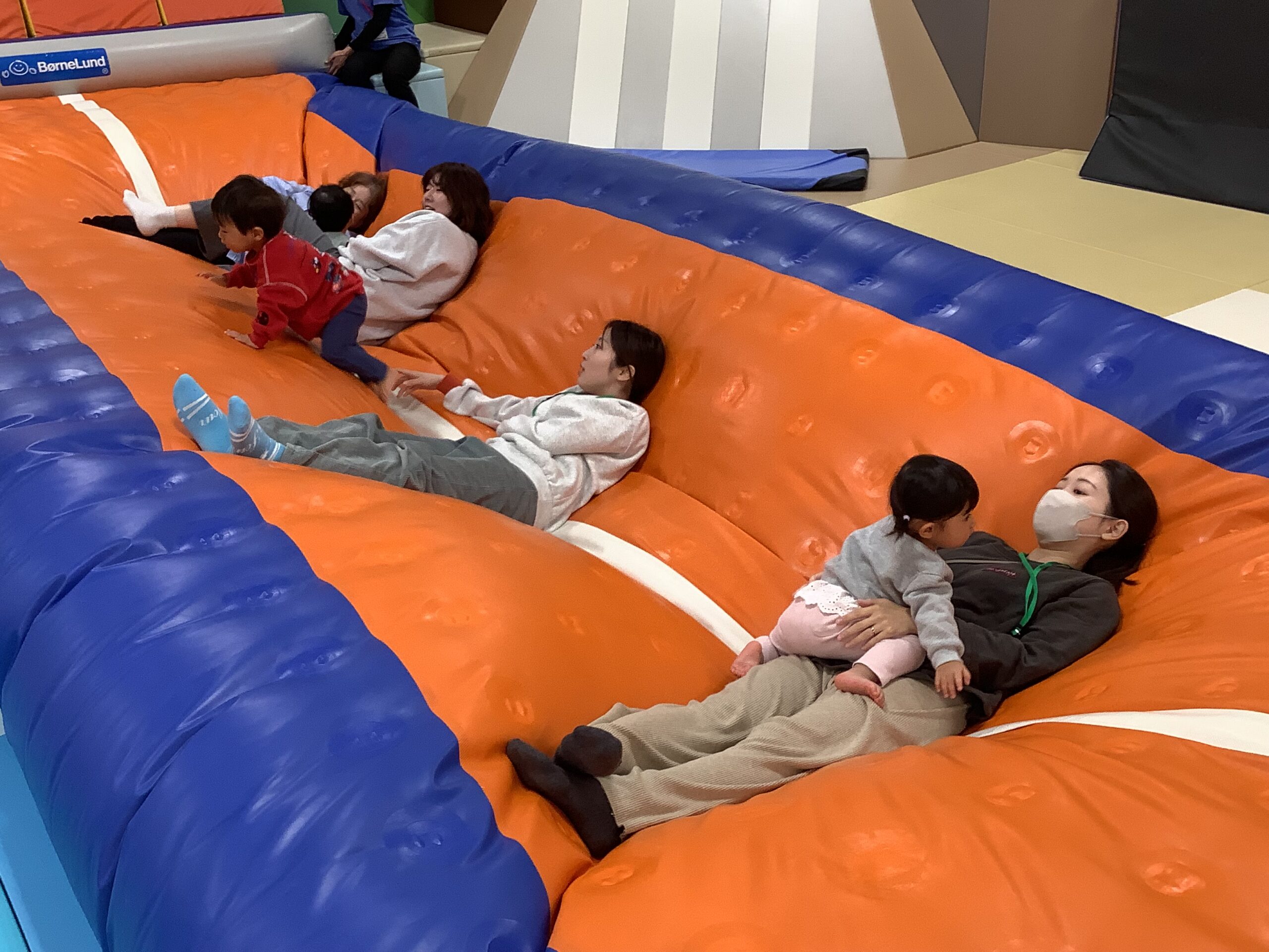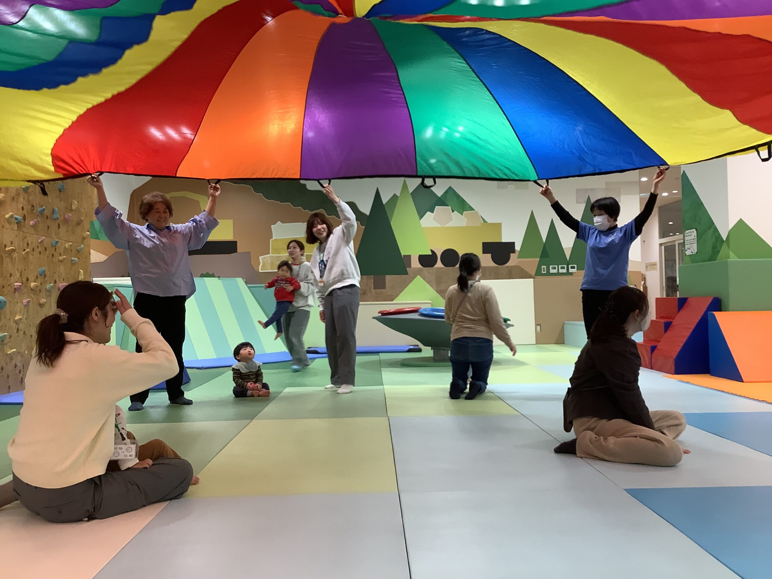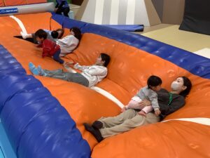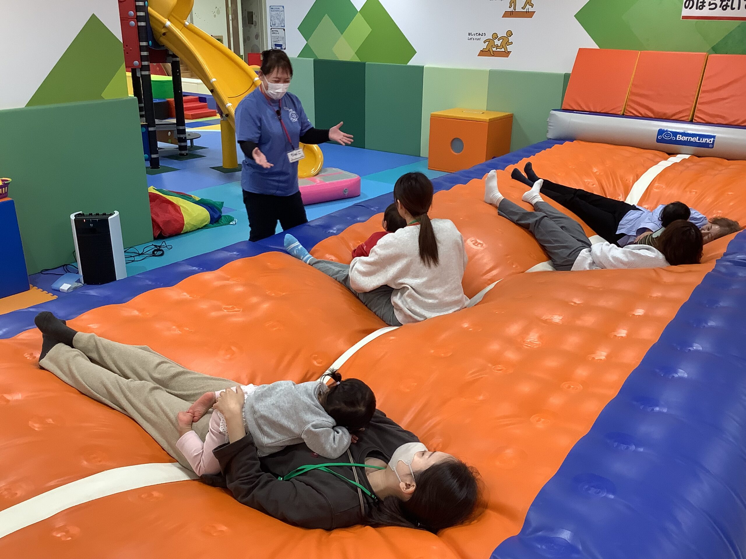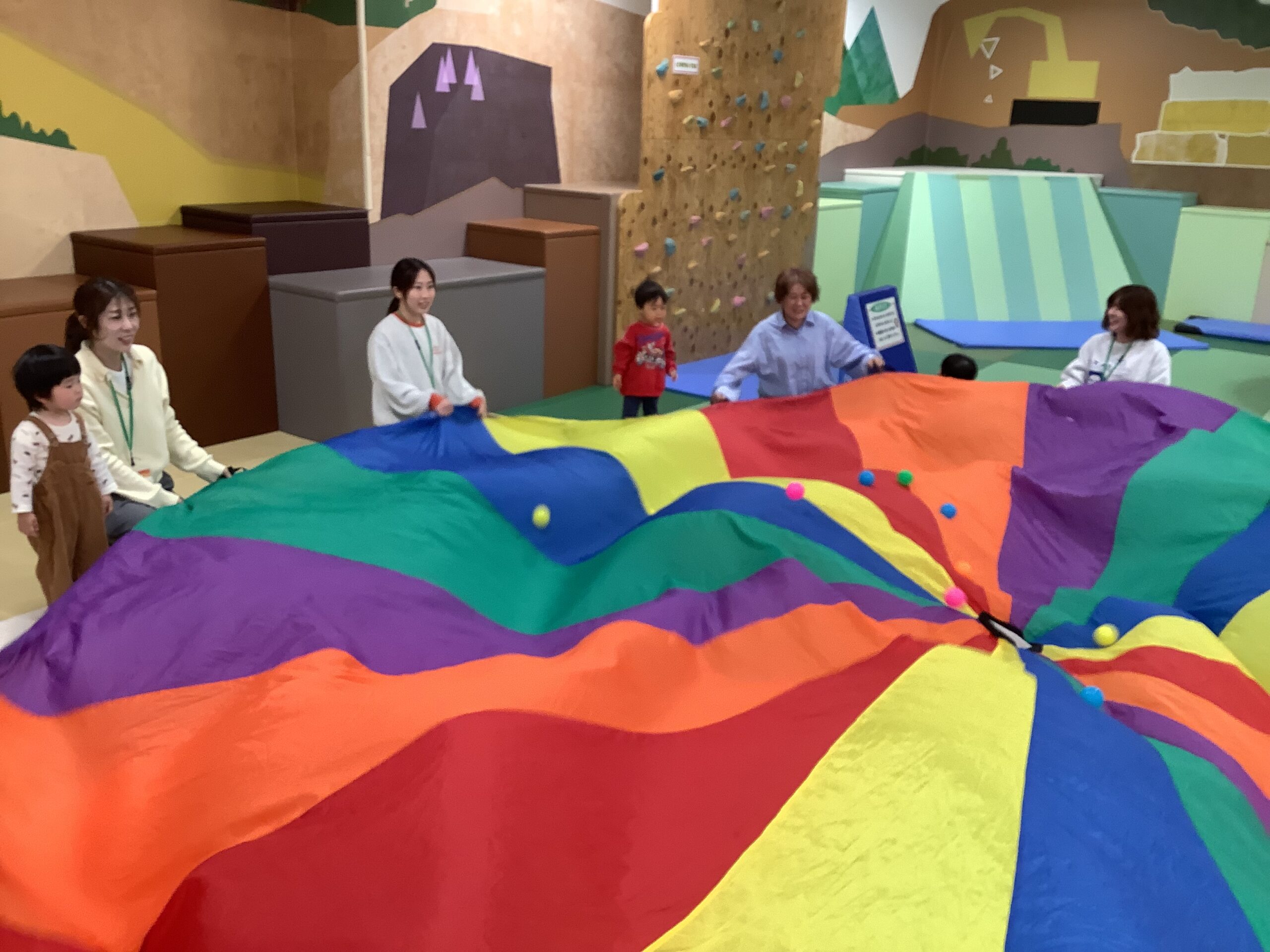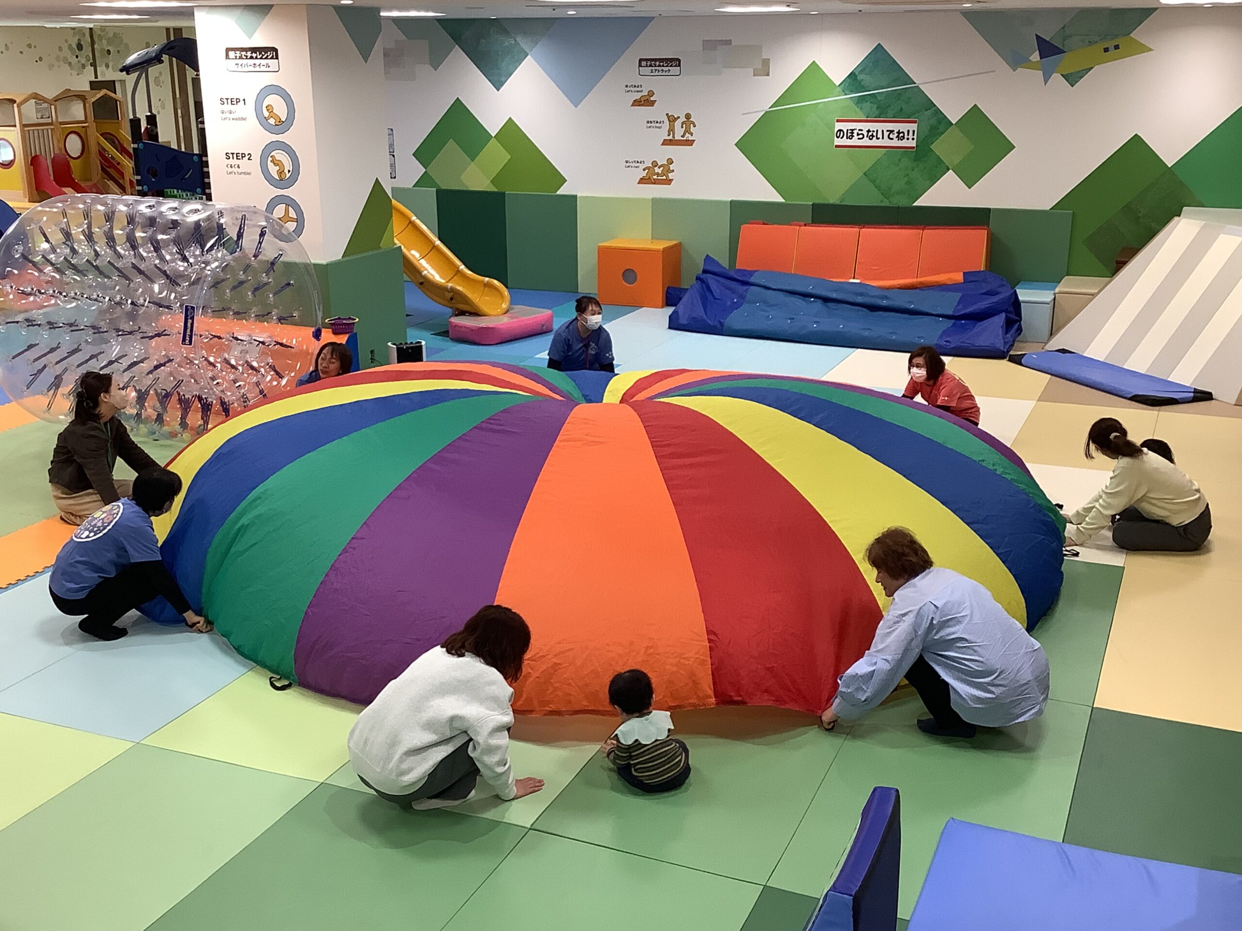 ゆぅ~らゆら、ふぅ~わふわ!カラフルなパラバルーンの中に入ったり、上に乗ったり…ボールがコロコロ、子どもたちもコロコロ楽しそうに遊んでいましたよ (^_-)-☆ 最後は「ふわふわベッド」の おまけつき!