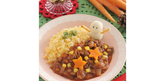 1月のクッキングメニューは『キャロットライスのハッシュドビーフ・スノーマンポテト』(お持ち帰り)です…